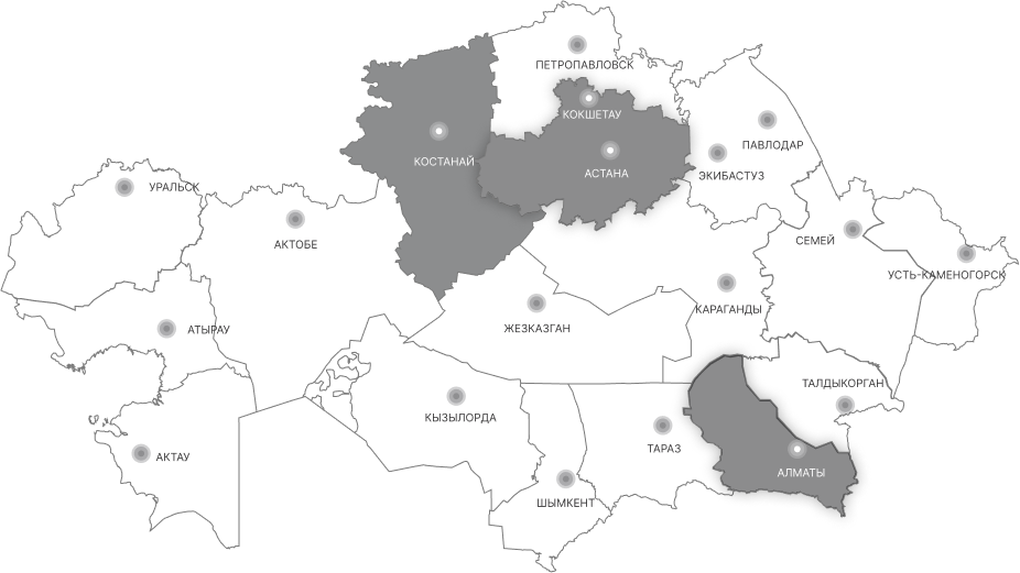 Астана (головной офис, розница), Алматы (дистрибуция, розница), Костанай (производство)